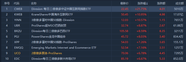 从ETF涨幅榜来看,涨幅居前的ETF集中在做多中国互联网。其中二倍做多中证中国互联网指数ETF $CWEB 上涨21.75%,成交额5010万美元;中国海外互联网ETF $KWEB 上涨10.95%,成交额17.07亿美元。