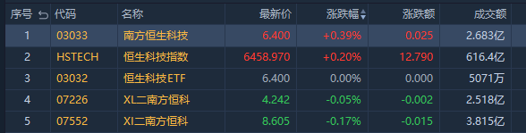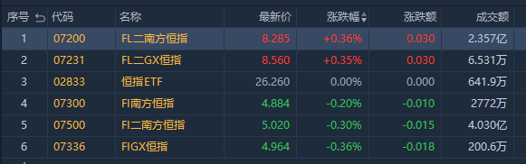 南方两倍做多恒科 $07226.HK 跌0.05%,成交额约2.518亿港元;