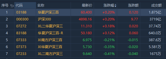 沪深300指数收涨0.20%。其中,华夏沪深三百ETF $03188.HK 涨0.20%,成交额约1.875亿港元;华夏沪深三百-R $83188.HK 涨0.12%,成交额达640.0万港元。
