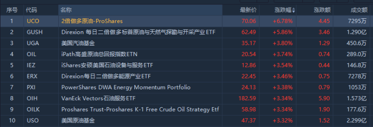 ETF涨幅方面,2倍做多原油 $UCO 上涨6.78%,成交额7295万美元;二倍做多标普与原油与天然气勘探与开采产业ETF $GUSH 上涨5.86%,成交额达1.290亿美元。