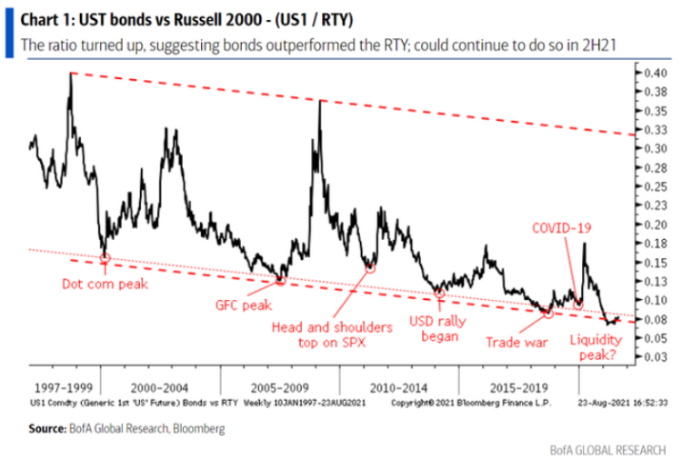 据美国银行称,在过去,当这类比率见底时,通常意味着债券即将上涨,那么年前这段时间的风险偏好大概会逐渐下行。当前,正值病例激增、疫苗对德尔塔毒株的效力受到质疑之时,而且美联储何时开始缩减购债也悬而未决,所以这类观点还是值得关注的。
