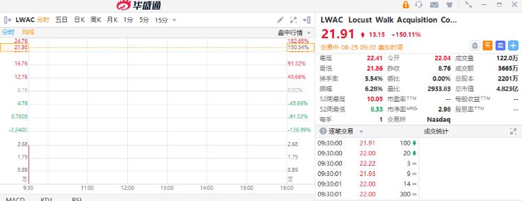华盛资讯8月25日讯,美股早盘,Locust Walk Acquisition(LWAC)开盘暴涨150%,公司批准了与之前宣布的与Efftor Treeutics的SPAC合并业务提议。