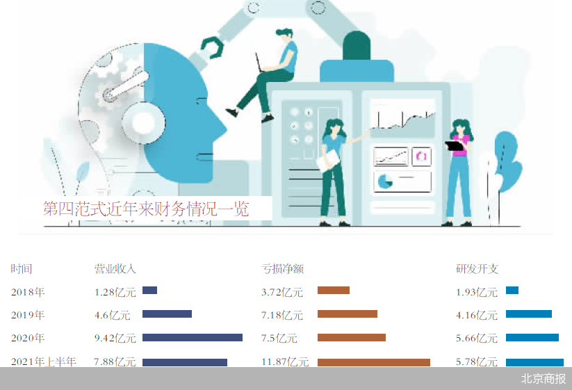 数据显示,2018-2020年以及2021年上半年,第四范式分别产生亏损净额3.72亿元、7.18亿元、7.5亿元、11.87亿元,其中今年上半年亏损额大幅增加。经北京商报记者计算,三年半时间,第四范式合计亏损30.27亿元。