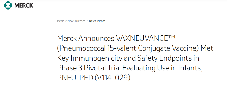 8月25日,默沙东 $MRK 宣布,其15价肺炎球菌结合疫苗Vaxneuvance,在入组年龄为42-90天的健康婴儿中进行的关键性3期临床试验PNEU-PED中达到主要终点。Vaxneuvance此前已经获得FDA批准,用于18岁以上的成人。