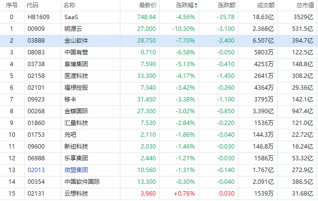 盘面上,兑吧、新纽科技、金蝶国际、微盟集团等跌逾1%;仅云想科技微涨。