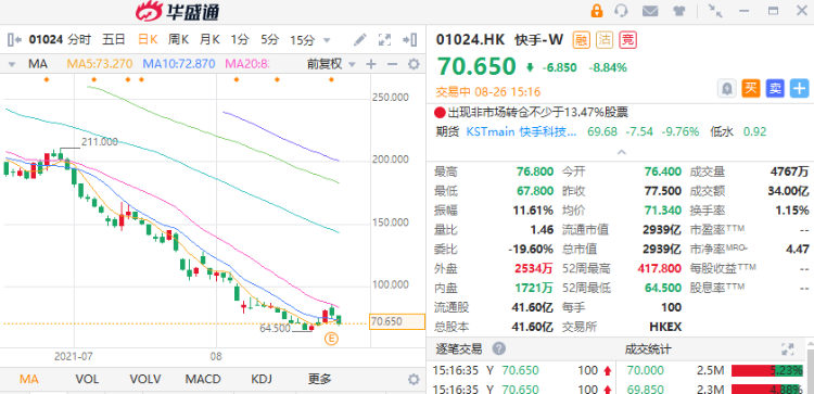 今年2月份,快手上市之初便被热炒。6个交易日,快手股价创出417.8港元/股的历史最高点,市值一度高达1.74万亿港元。而截至8月26日14:34分,快手股价为70.1港元/股,总市值2916.27亿港元,半年时间,快手市值蒸发近1.5万亿港元!