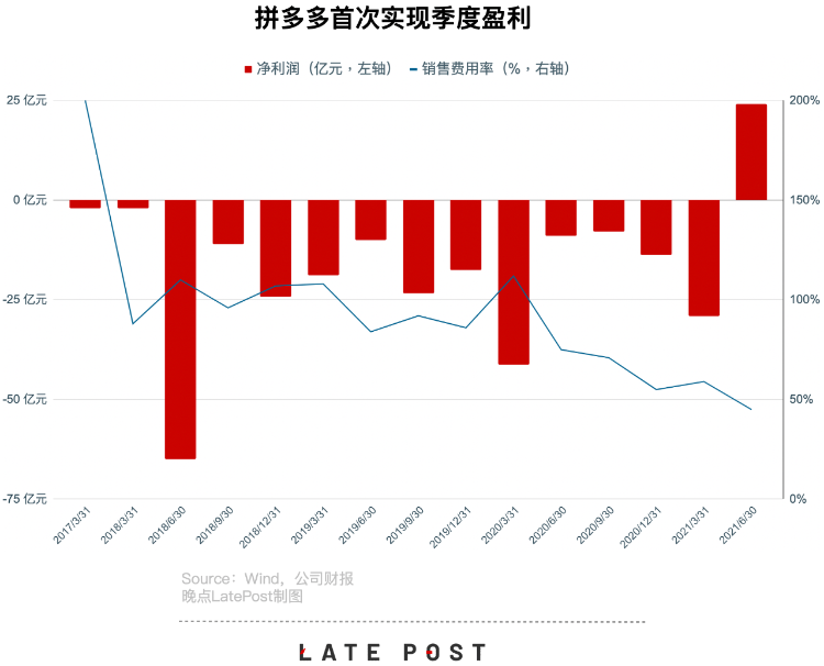 利润暴涨和历史新低的营销费用率直接挂钩。连续两个季度,拼多多高层都表示平台对投资回报率有更高的要求。当期他们的营销开支只有 103 亿元、占收入比重降至 45%。该销售费用率分别比今年一季度和去年四季度少了 14 个和 10 个百分点。