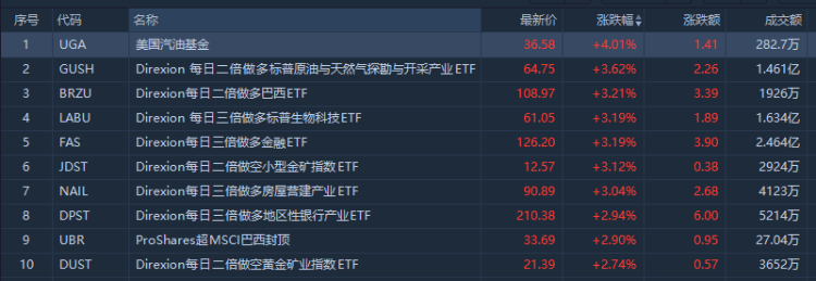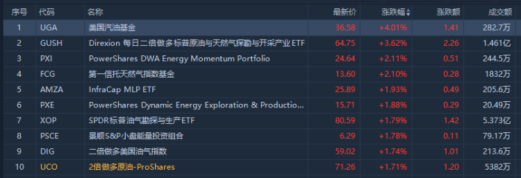 能源ETF涨幅榜方面,涨幅靠前的有每日二倍做多标普原油与天然气勘探与开采产业ETF $GUSH 上涨3.62%,成交额达1.461亿美元;第一信托天然气指数基金上涨2.10%,成交额达1832万美元。