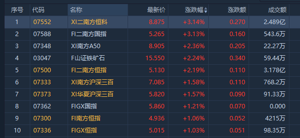 今日涨幅位居前的ETF有南方两倍做空恒科 $07552.HK 涨3.14%,成交额2.489亿港元;南方两倍看空国指 $07588.HK 涨3.13%,成交额543.6万港元。