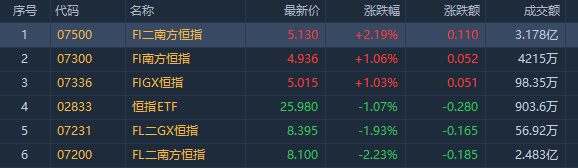 今日港股涨幅居前的ETF有南方两倍看空恒指 $07500.HK 涨2.19%,成交额3.178亿港元;