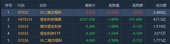 做多恒指相关ETF走弱,南方两倍做多恒科(07226.HK)跌3.58%,成交额1.771亿港元;