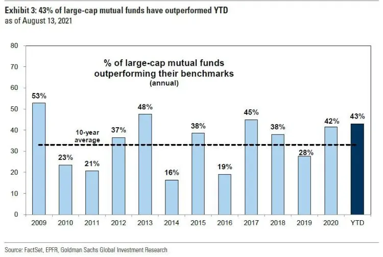 对冲基金研究的一项指数显示,上半年数据十分抢眼,多空股票基金自6月底以来回报率上涨了0.8%,高盛集团的数据显示,本季度三分之一的大型共同基金表现优于基准,而2021年前三个月的这一比例为57%。