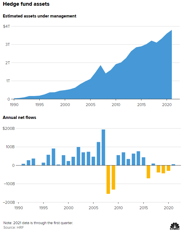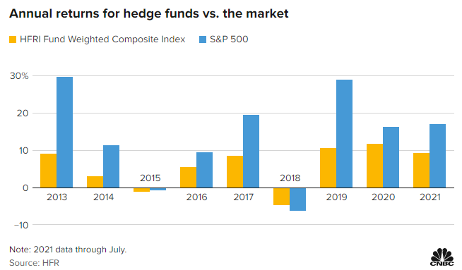 根据HFR的数据,截至7月底,对冲基金在2021年上涨了9.2%,不过,他们仍然明显落后于大盘,同期标普500指数上涨了17%。