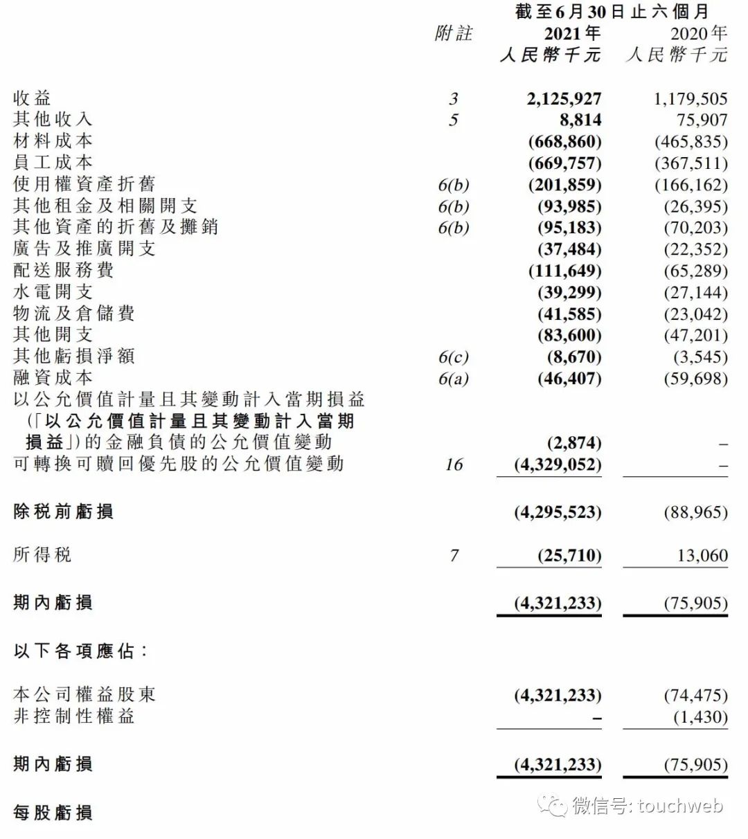 奈雪的茶2021年上半年期内亏损为43.21亿元,上年同期的期内亏损为7591万元。