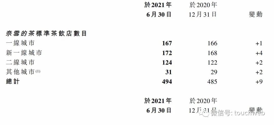 截至2021年6月30日,奈雪的茶一共有494家标准茶饮店,其中,167家在一线城市,172家在新一线城市,124家在二线城市,31家在其他城市。