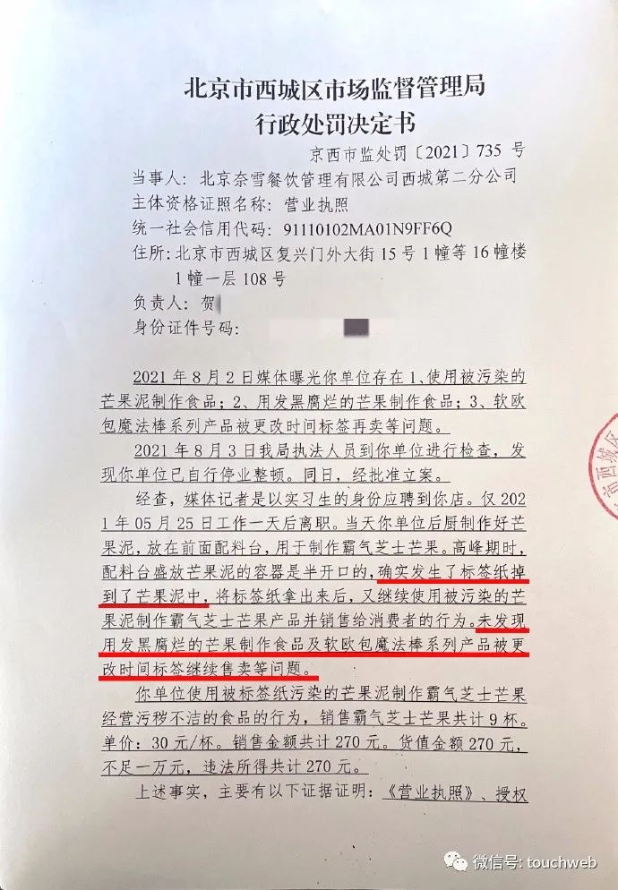 奈雪的茶称接受处罚,深感痛心,向广大消费者致以诚挚的歉意,并表示对照监管部门处罚决定书中指出的“在制作过程中标签掉入芒果泥”等问题展开自查自纠,要求所有门店员工严格按照生产流程进行操作,杜绝任何不规范行为。