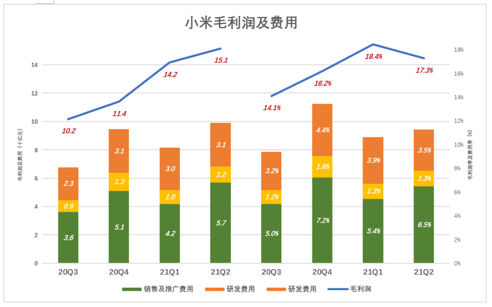2021年Q2,毛利润、毛利润率分别为151亿、17.3%;合计费用、合计费用率分别为99亿和11.3%;其中市场费用率提高到6.5%,换来的是营收同比增长64%。