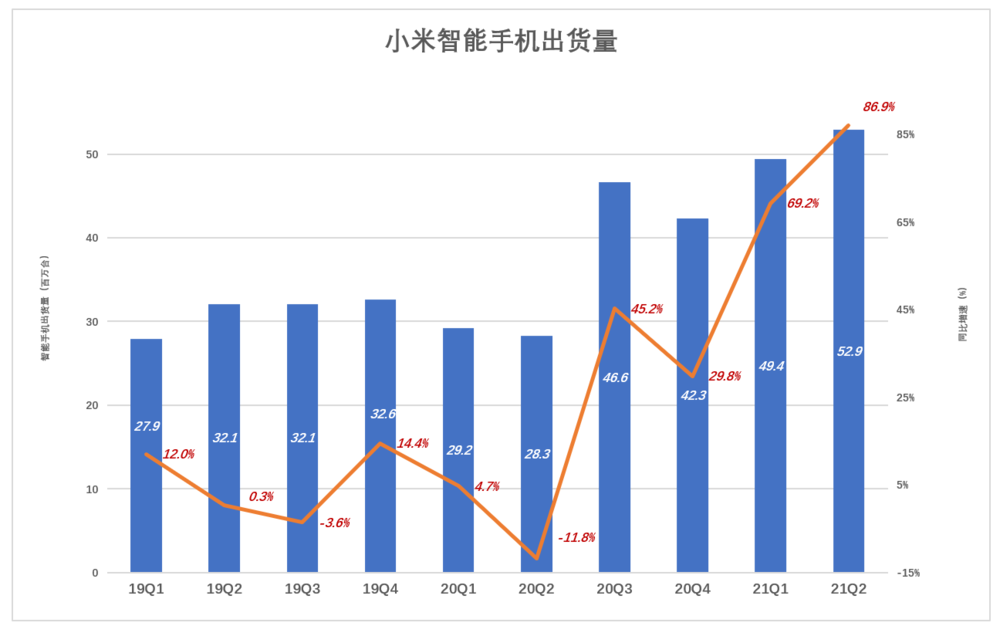 2021年8月25日盘后,小米集团(1810.HK)公布了2021年Q2业绩——总收入878亿、同比增长64%;经调整净利润63亿、同比增长87.4%;智能手机出货5290万部,跃居全球第二。