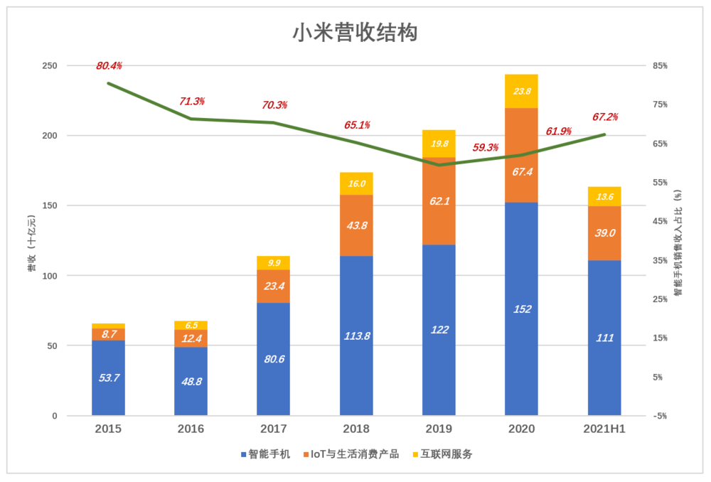 小米营收主要包括三个部分:智能手机、IoT与生活消费产品、互联网服务。