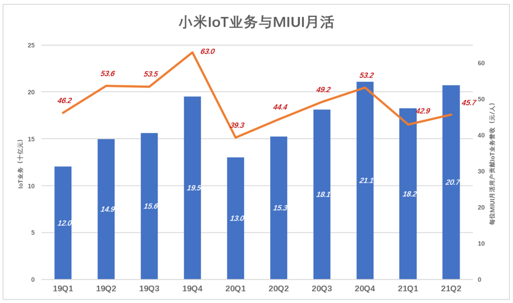 2021年Q2,IoT业务收入207亿,每位MIUI用户贡献45.7元。