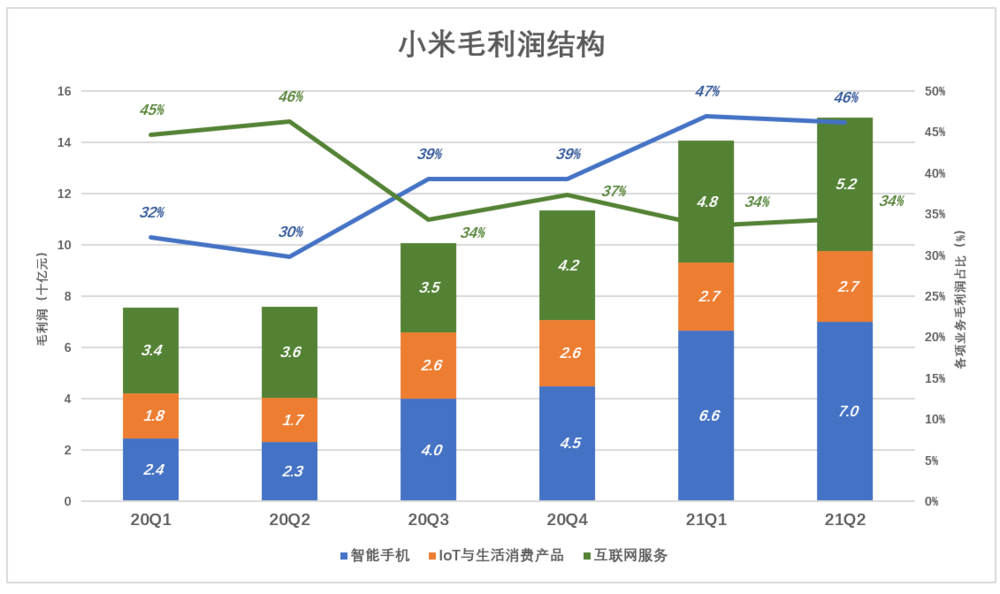 反转发生在2020年Q3,手机业务毛利润比互联网高出5个亿。到2021年Q2,差距拉大到18亿,手机业务毛利润达70亿、贡献率46.2%,互联网服务毛利润52亿、贡献率34.4%。