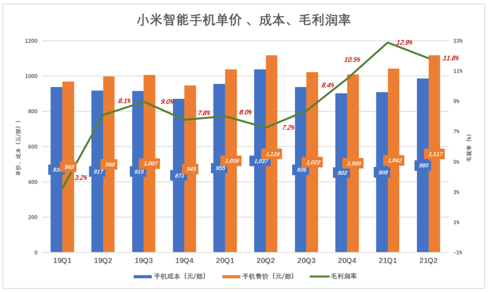 2021年Q2,ASP提高到1117元、单机成本降至985元,每部毛利润132元、销售毛利润率11.8%