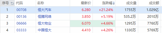 华盛资讯8月27日消息,恒大系早盘全线上涨,截至发稿,恒大汽车上涨21.24%;恒大物业上涨5.19%;中国恒大上涨4.66%;恒腾网络上涨4.26%。