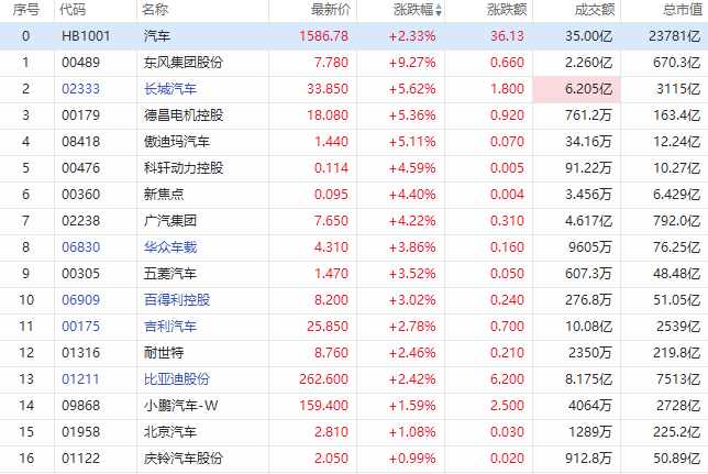 截至发稿,东风集团股份涨9.27%,报7.78港元每股,成交额2.26亿港元;长城汽车涨5.62%,报33.85港元;吉利汽车涨2.78%;广汽集团涨4.22%;比亚迪股份、小鹏汽车、北京汽车等跟涨。