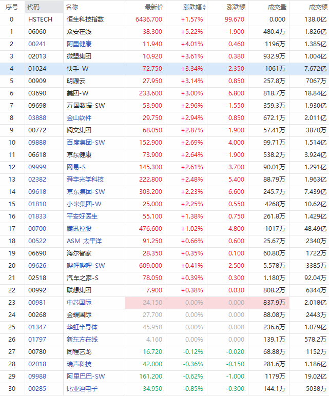 盘面上,众安在线上涨5.22%;阿里健康上涨4.01%;快手、美团涨超3%;百度、京东健康、京东集团、小米等涨超2%;腾讯控股涨超1%。
