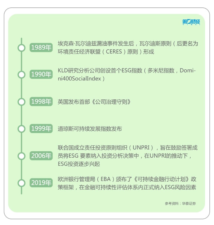 全球ESG投资的正式兴起始于1990年代。资源的短缺、气候变化、公司治理等多方面议题被纳入社会责任投资的考量,这些问题逐渐被归类为环境、社会和治理三个方面。