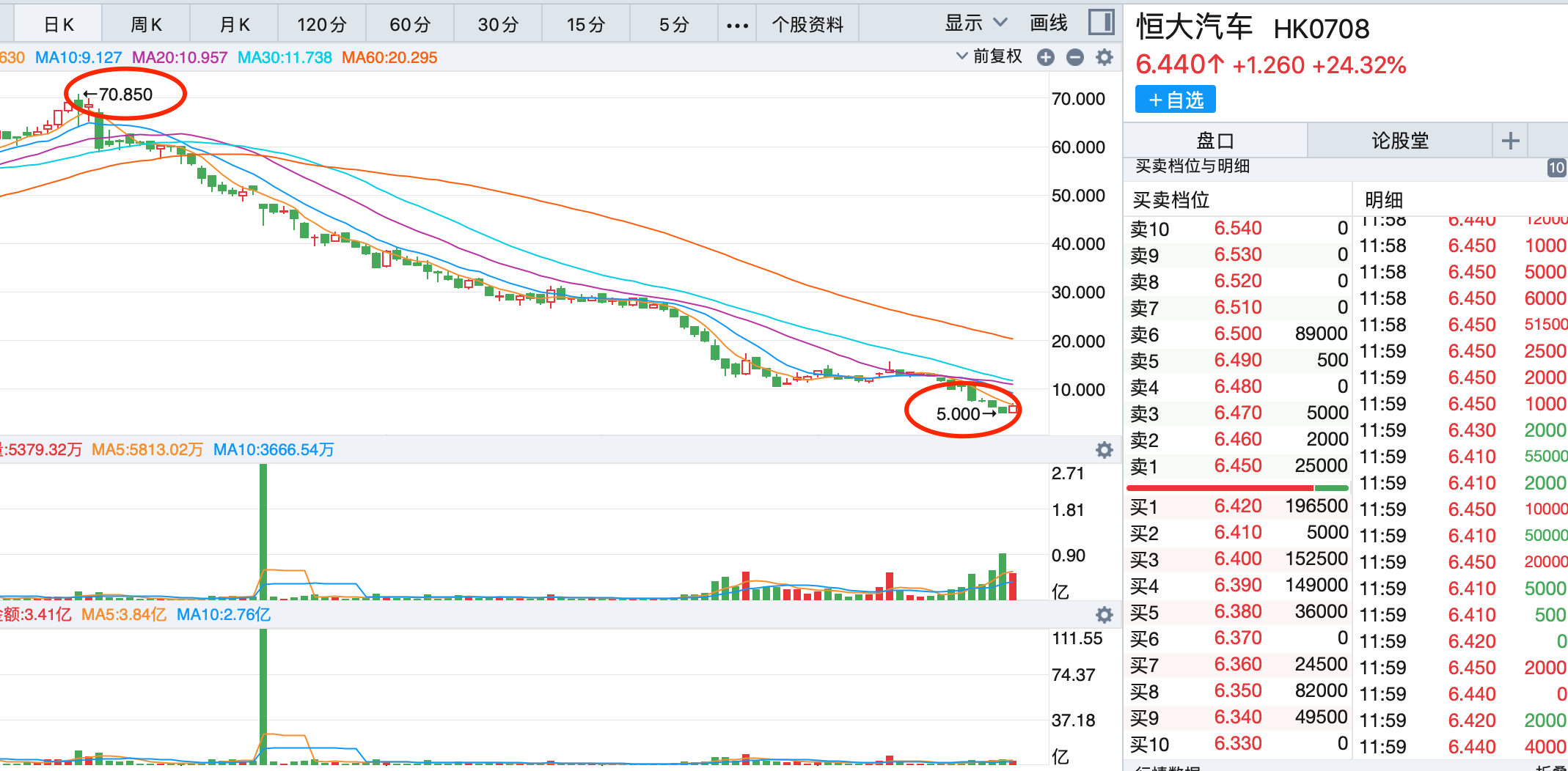 从股价表现看,恒大汽车自今年4月起呈现一路下跌情况。去年6月12日,恒大汽车股价是7.13港元,到今年2月17日报72.25港元,市值逾7000亿港元,8个月涨了10倍。但今年4月21日开启暴跌模式,8月26日收5.18港元,相比高点下跌超过90%。