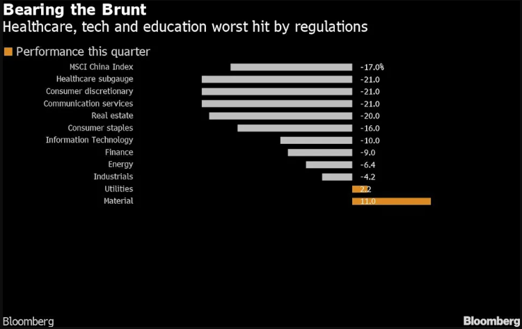 如下图所示,自6月30日以来,跌幅居前的板块包括通信服务、非必需消费品及健康医疗,这三个板块分别暴跌21%,此外MSCI中国指数累计下跌达17%。