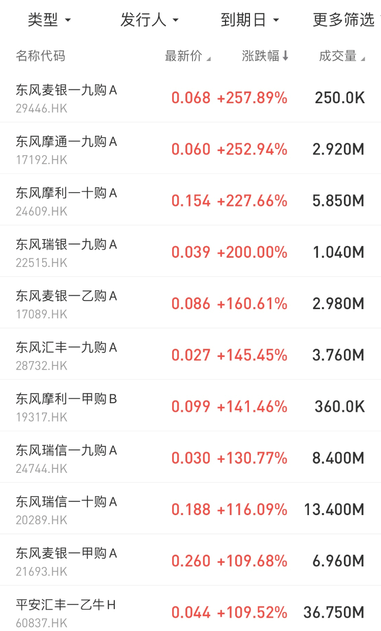 涨幅居前的包括: $29446.HK 东风麦银一九购A涨257.89%,占据排行榜第一; $17192.HK 东风摩通一九购A涨252.94%,东风集团共有13只购证涨超100%(包括100%)。