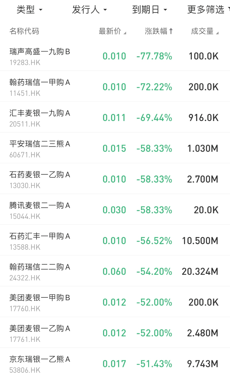 在今日跌幅榜中, $19283.HK 瑞声高盛一九购B跌77.78%; $20511.HK汇丰麦银一九购A跌69.44%。