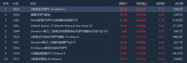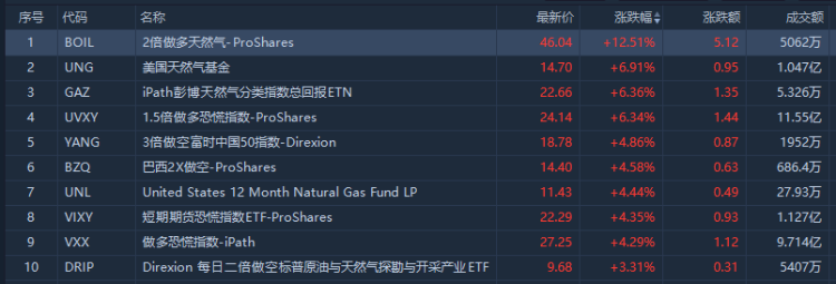ETF涨幅榜方面,涨幅居首位的是2倍做多天然气 $BOIL 暴涨12.51%,成交额达5062美元。美国天然气基金 $UNG 上涨6.91%,成交额达1.047亿美元。
