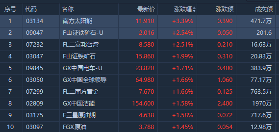 今日涨幅位居前的ETF有南方太阳能 $03134.HK 上涨3.39%,成交额471.7万港元;F山证铁矿石上涨2.54%,成交额达201.6万港元。