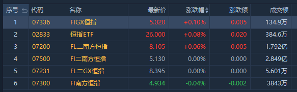 跌幅居前的有看空南方恒指 $07300.HK 微跌0.04%,成交额达3843万港元。