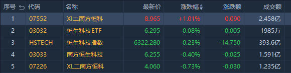 做空恒指相关ETF走强,其中南方两倍做空恒科(07552.HK)涨1.01%,成交额2.458亿港元。