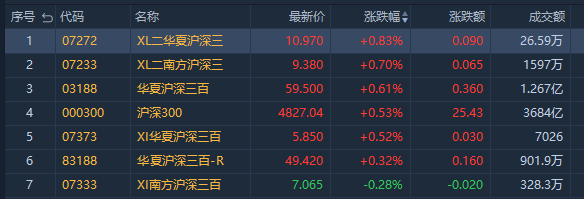 沪深300指数收涨0.53%。其中,华夏沪深三百-R(83188.HK)涨0.32%,成交额901.9万港元;华夏沪深三百ETF(03188.HK)跌0.61%,成交额1.267亿港元。