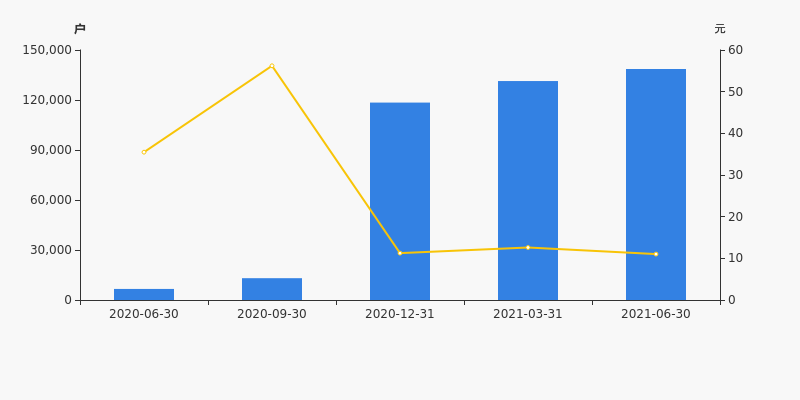 2020年6月30日至今,公司股东户数成倍增长,区间涨幅达1988.02%。2020年6月30日至2021年6月30日区间股价下降68.94%。