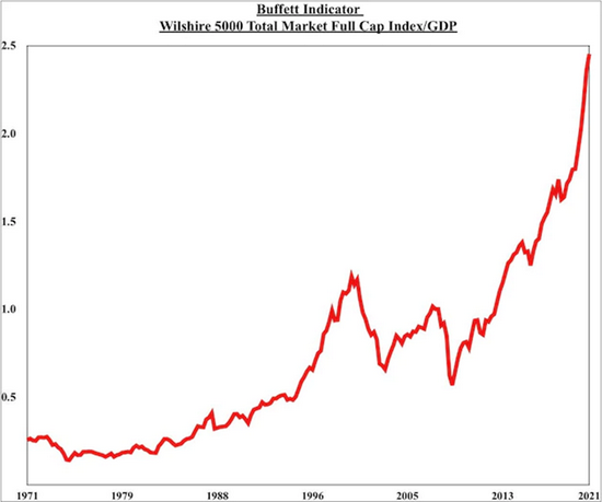 此外,自去年春天以来,疫情扰乱了经济活动,压低了GDP,同时也促使联邦政府支持企业,在此过程中支撑了市场。因此,巴菲特指数的读数可能被人为夸大,并可能随着经济复苏和企业撤回援助而下降。