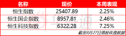 恒生指数本周上涨2.25%,报25047.89;恒生科技指数上涨7.25%,报6322.28;国企指数上涨2.46%,报8957.81点。