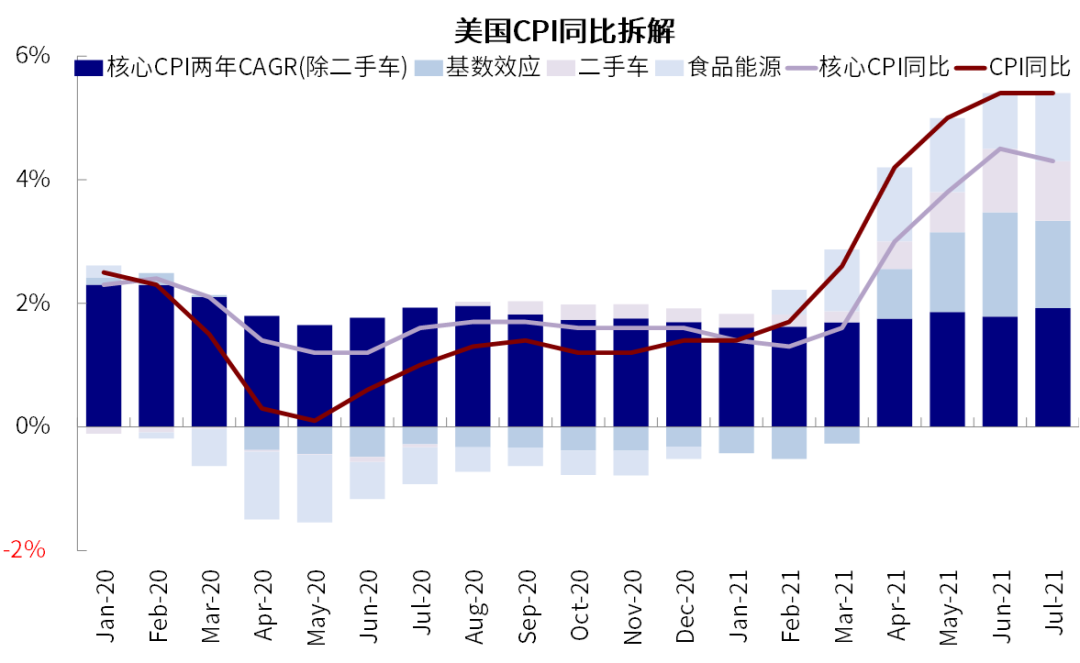 1)提前减量的风险基本被消除。目前距离年底还有9月、11月和12月三次会议,12月开启减量时市场多数共识,9~11月就开启减量明显是超出预期的。但由于鲍威尔表示年内减量时合适的、但需要依据未来数据评估Delta变异病毒的风险,同时通胀的一些暂时性因素和供需矛盾在缓解,因此我们预计减量提前到9~11月的可能性基本可以排除。