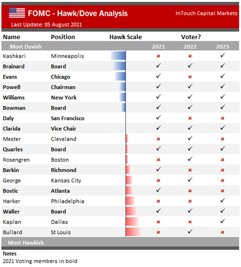 4)相比联储官员的表态,主席鲍威尔的观点更为重要。此次会议前,一些联储官员的鹰派表态(如9月份就开启减量)一度对市场情绪造成了较大扰动,但事实证明,相比一些甚至今明两年没有投票权的委员或地方联储官员的表态,鲍威尔的观点和看法显然更重要,因此其参考意义未必很强。如果鲍威尔真的受到内部鹰派力量较强的压力要在9月份就开始减量的话,那么不可能不利用此次会议作为一个向市场传递信号和吹风的窗口。