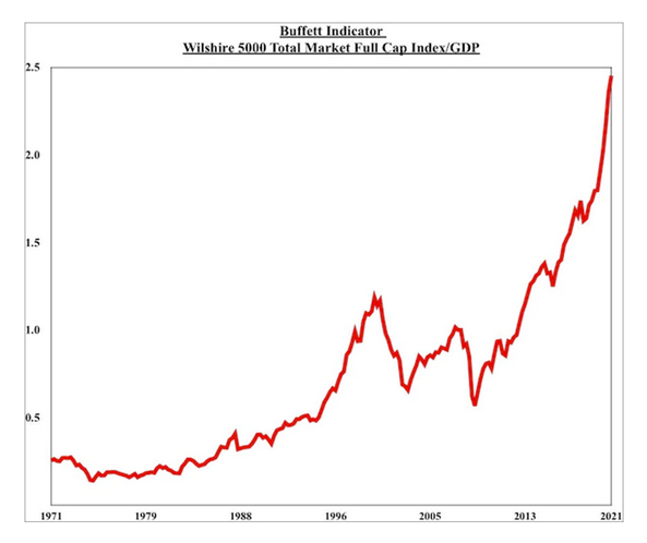 “巴菲特指标”是将美国所有公开交易股票的总市值除以最新季度国内生产总值(GDP)数据,它可以作为股市估值相对于经济规模的粗略衡量。周三 Wilshire 5000总市场指数收于46.69万亿美元附近,标准普尔500指数和纳斯达克指数均收于纪录高位。 与此同时,对第二季度GDP的最新估计为22.72万亿美元,这令巴菲特指标达到205%。这一数字远高于2020年第二季度的187%,当时疫情正全面爆发,GDP下降了约15%。