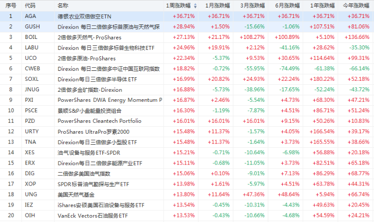 从ETF涨幅榜来看,做多油气股、中证互联网指数、半导体板块和金矿指数的ETF本周领涨。