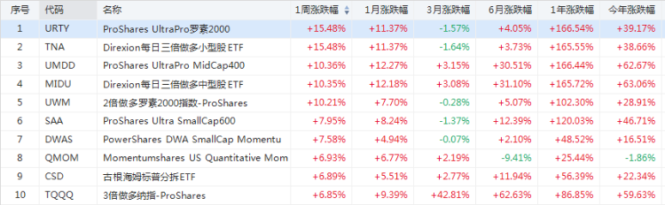 股指方面,小型股指数本周表现突出,其中3倍做多罗素2000指数的 $URTY 涨幅居前,一周上涨15.48%,该ETF目前最大成分股为此前散户抱团“龙头股”AMC院线;中型股表现其次,3倍做多中型股的 $UMDD 和 $MIDU 齐涨超10%。