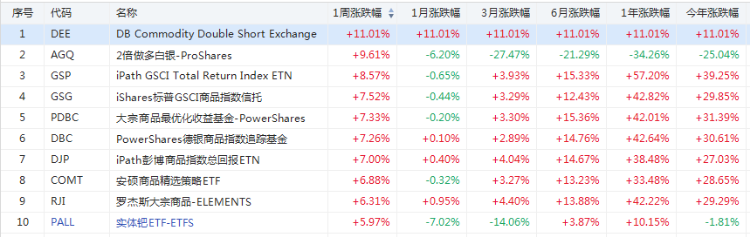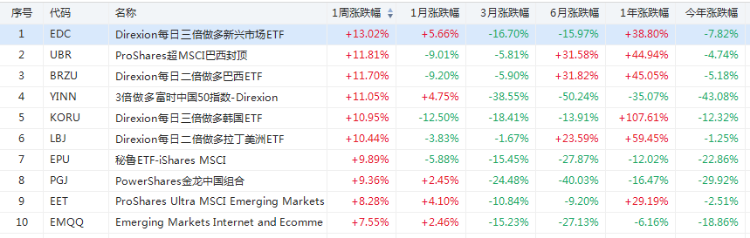 其中3倍做多新兴市场的 $EDC 、2倍做多巴西的 $BRZU 、3倍做多富时中国50指数的 $YINN 和2倍做多拉丁美洲的 $LBJ 都录得超过10%的周涨幅。
