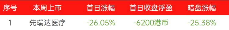 介入医疗器械企业先瑞达医疗-B(06609.HK)本周二挂牌港交所,首挂收跌26.05%,一手账面浮亏6200港币。周内小幅回升,累计跌23.95%。