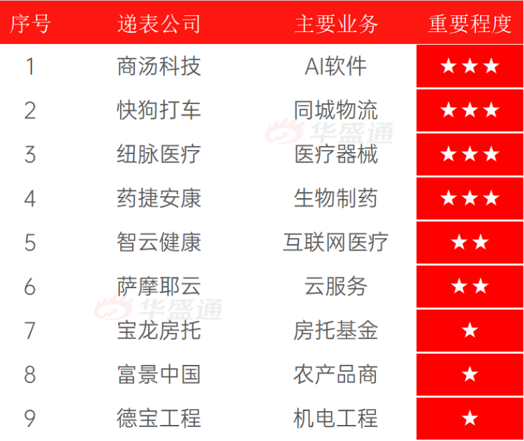 本周共有九家公司递交上市申请,其中较为重要为AI独角兽-商汤科技、同城物流平台-快狗打车,心脏医疗器械企业-纽脉医疗等